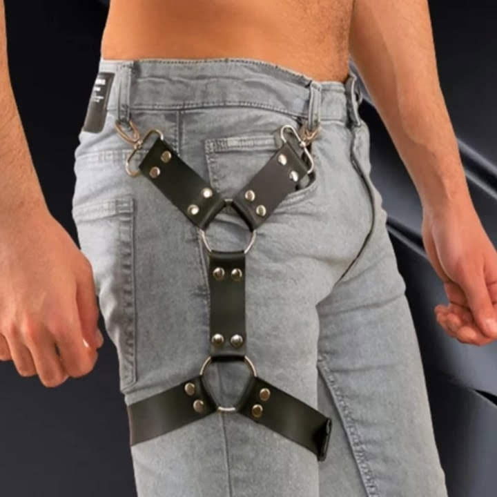 Arnés de pierna de hombre con mosquetón es regulable. Material Cuero Ecologico. Color Negro Rojo y Rosa.